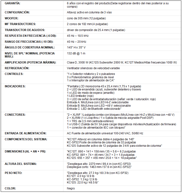 El sistema KC12 está compuesto por un subwoofer que contiene un driver de 12 pulgadas que logra reproducir graves de hasta 40 Hz. El diseño novedoso de la caja acústica de frecuencias medias/agudas posee un driver de compresión de 1 pulgada combinado con la innovadora guía de ondas LEAF™ (Length-Equalized Acoustic Flare) de QSC, así como dos drivers de medios de gran excursión de 4 pulgadas. Gracias a su diseño de 3 vías, el sistema ofrece una sorprendente cobertura horizontal de rango completo de 145 grados y 35 grados de cobertura vertical hacia el público, con un sonido limpio y natural a cualquier volumen.