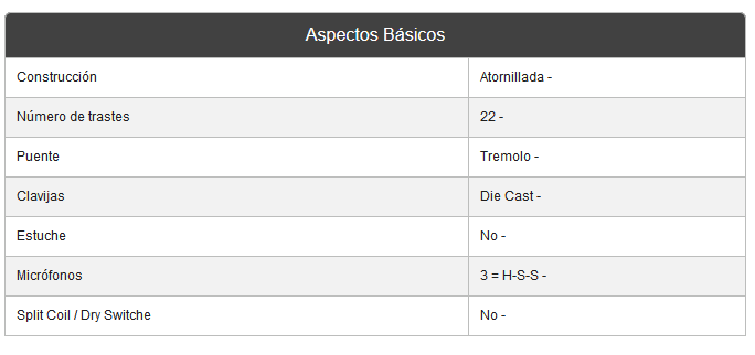 3 microfonos tipo Humbucker (doble), Single (sencillo), Single (sencillo) y selector de 5 posiciones.